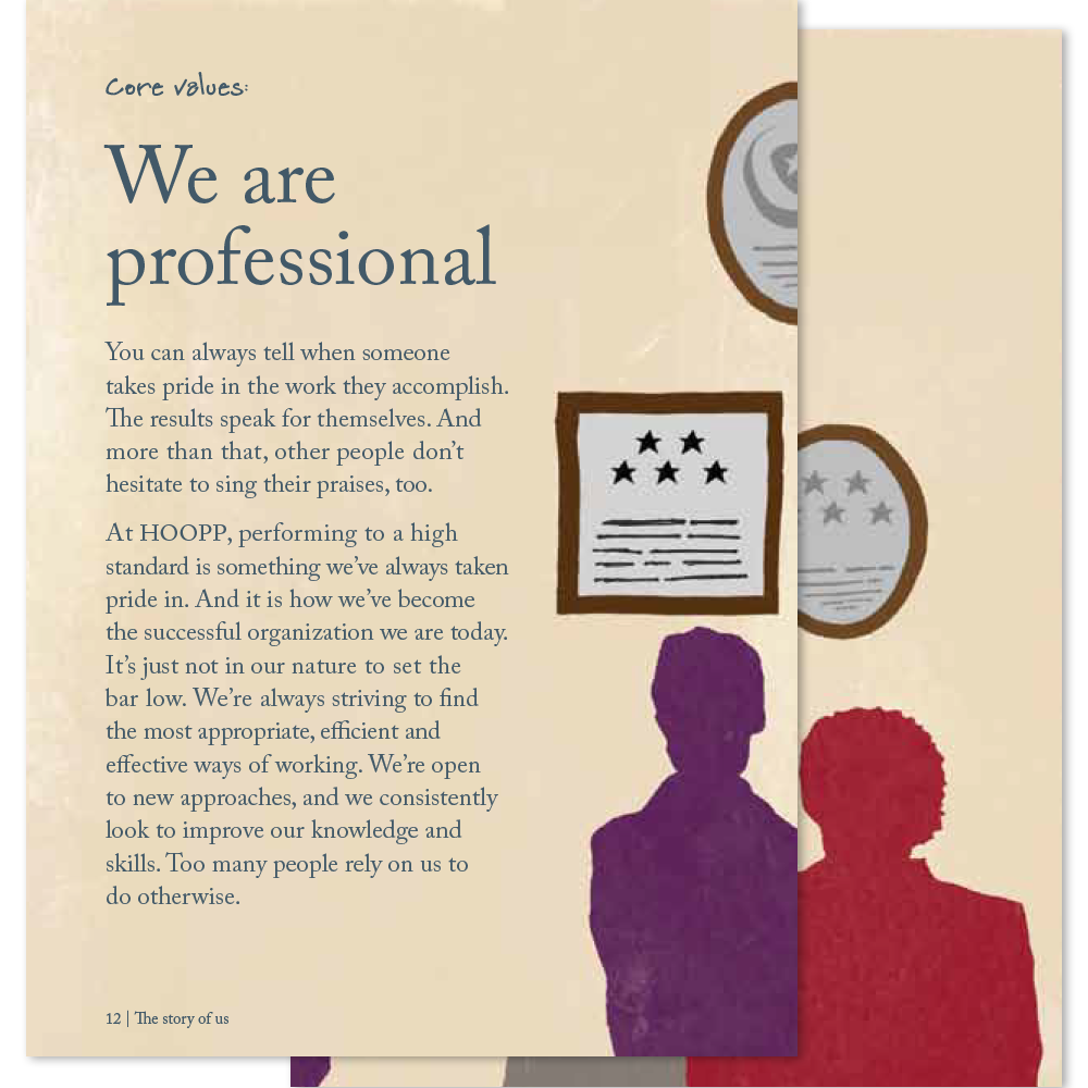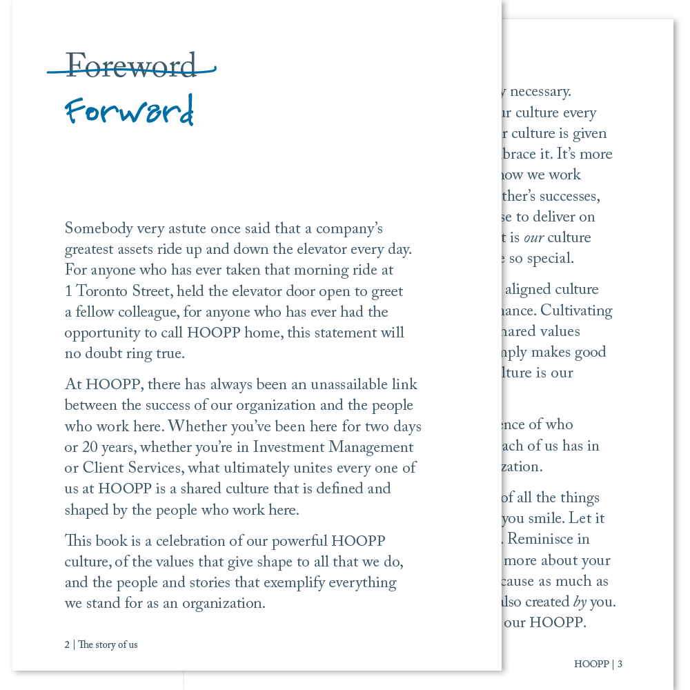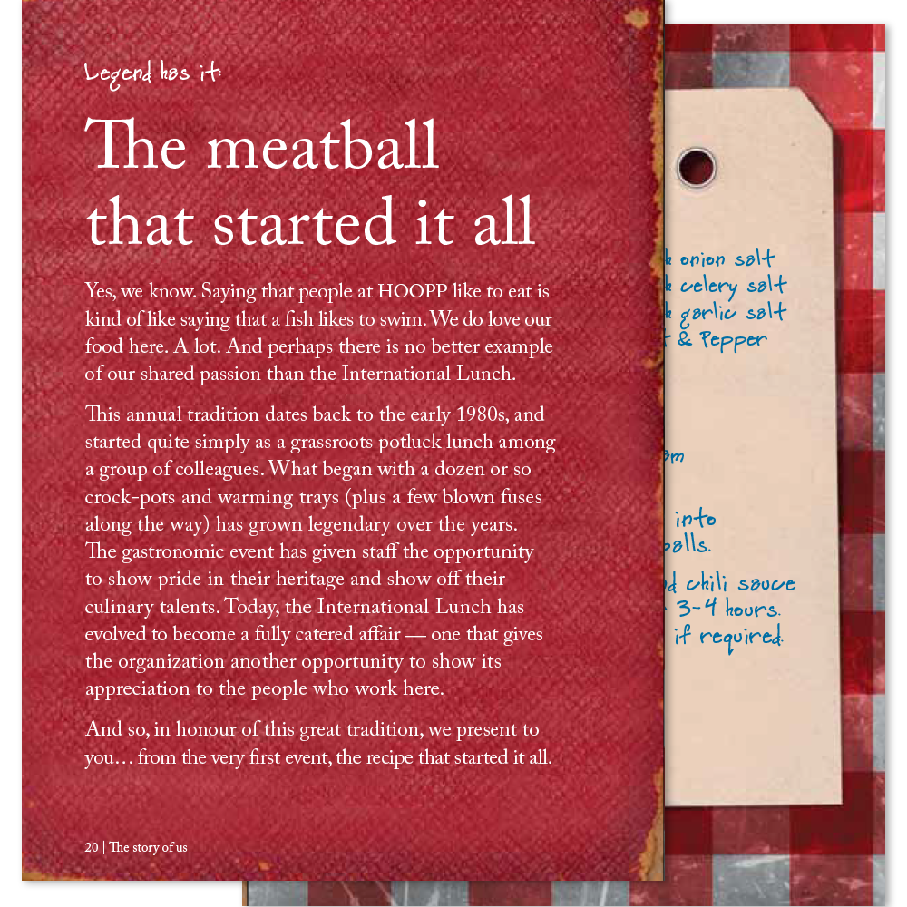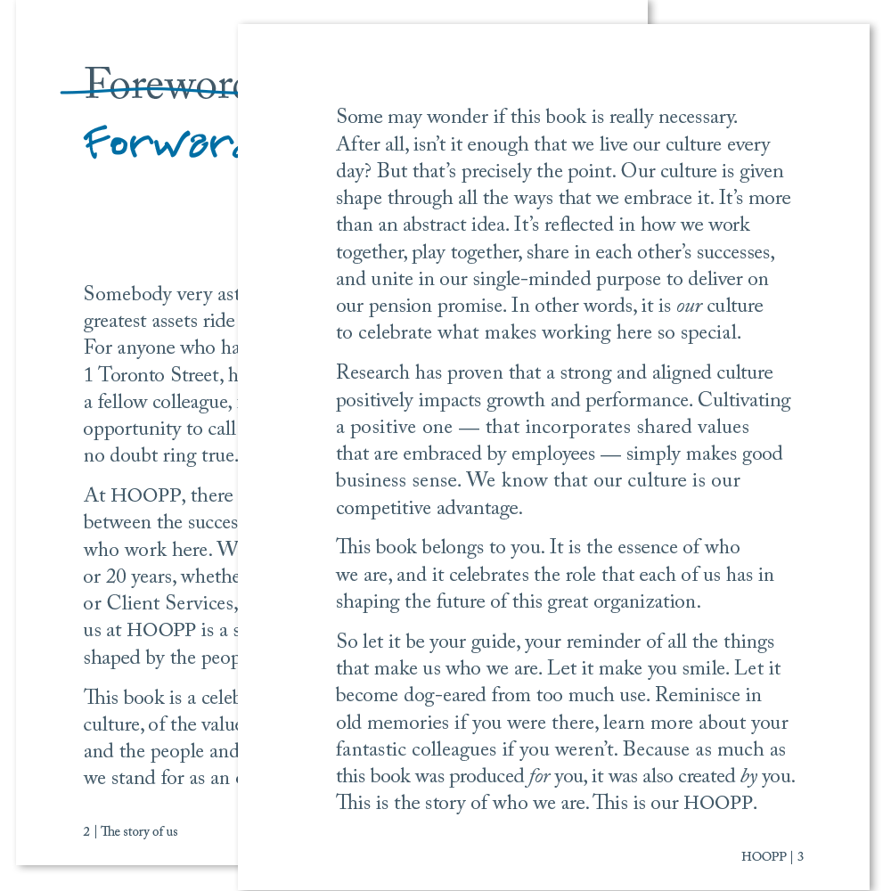 In addition to being one of Canada’s most successful pension plans, HOOPP is also an organization with an award-winning corporate culture. In a year when HOOPP celebrated its 50th anniversary and introduced a new brand, we worked with Zync to create a unique book that showcases HOOPP’s strong internal culture, instills pride among its employees and reinforces their role in living the HOOPP brand.